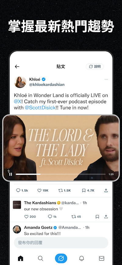 搜寻与探索区提供热门话题与趋势标签,也能用关键字查找内容与帐号。通知页能集中查看互动动态,并可筛选提及你的内容,私讯则提供一对一的非公开交流空间。另有语音空间等功能,并提到可透过音讯与通话形式和其他使用者交流,让互动不只停留在文字贴文。
