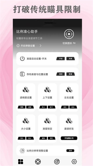 比例准心助手是一款专注于游戏准星设置的辅助工具,用户可根据个人需求自定义所需的准星样式。软件支持实时开启,操作流程简单直观。内置的准星参数覆盖十分齐全,方便用户随时查看并快速调整,帮助玩家在游戏中获得更精准的瞄准体验。
