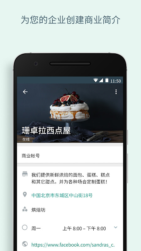 你可以设置:公司地址(带地图定位)、邮箱、官方网站、营业时间、业务介绍。