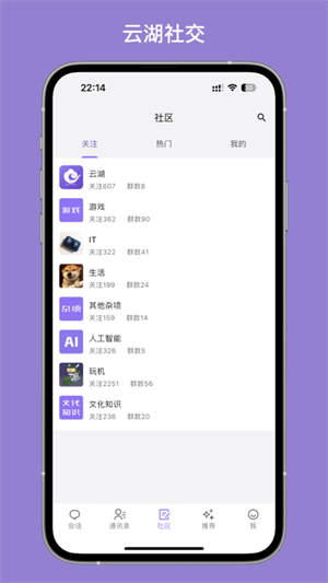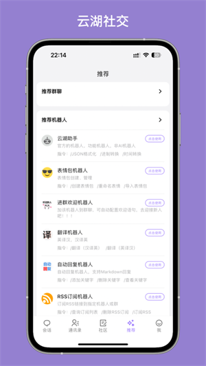 云湖社交是一款功能实用的聊天交流软件,致力于通过智能化的工具与人性化的设计,为用户提供更加高效、便捷的社交体验。平台支持接入各类机器人服务,可大幅提升用户的生活与工作效率,从日常提醒、信息查询到自动化任务处理,一应俱全。云湖社交在产品设计上专注于解决传统社交软件中的痛点,轻松连接并使用各种人工智能项目,让前沿技术真正服务于日常沟通。通过搭建知识社区,为用户提供学习交流的空间,促进信息共享与社会进步。陌生人可随时申请成为好友,在线互动聊天打破社交壁垒。所有好友统一聚合到通讯录中进行集中管理,查找方便、沟通高效。无论是工作协作、兴趣社交还是效率提升,云湖社交都能为您提供一站式的解决方案。有需要的用户不妨下载尝试一下。