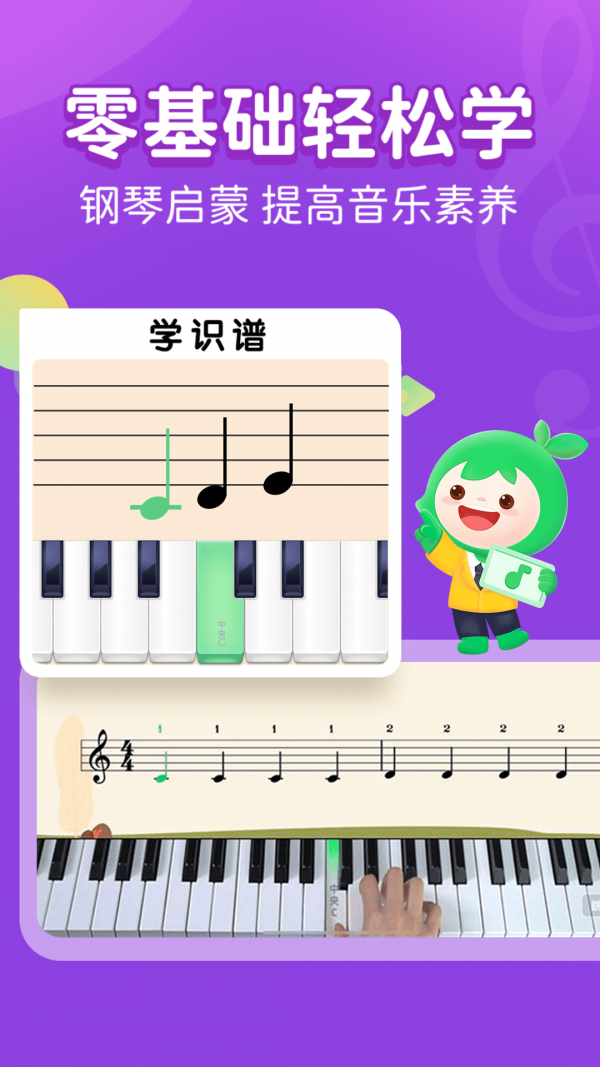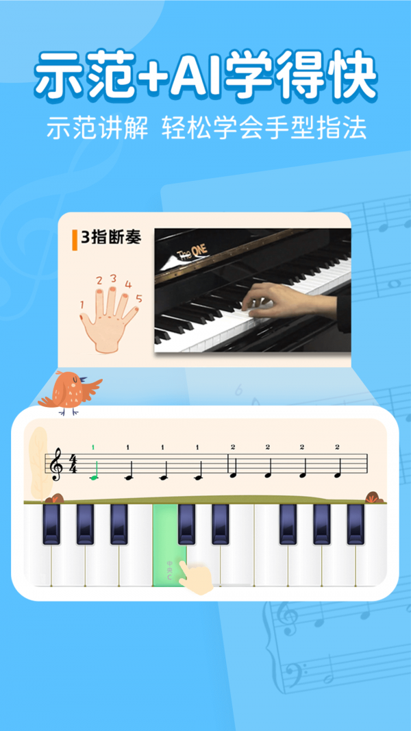 视频讲解和ai考核游戏相结合,重视培养练琴兴趣,有趣不枯燥。
