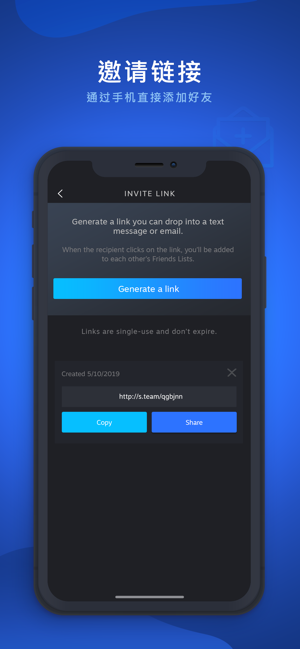 邀请链接:使用链接在 Steam 上添加好友。 生成邀请链接用于短信或电子邮件。