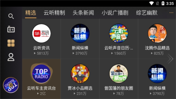 1、打开云听车机版app,在主界面可以看到音乐、娱乐、听书、头条、文史这几个功能板块