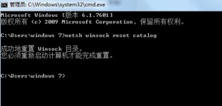 3、输入【netsh winsock reset catalog】命令回车确定,重置windows目录,按照提示重启电脑即可。