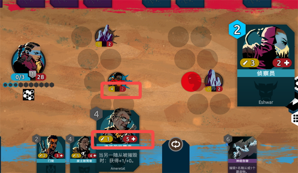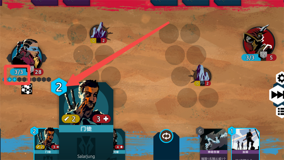 4.随从具备两种数值,左侧为攻击力,右侧是生命值,生命值归零时随从将被摧毁。