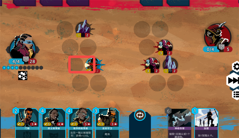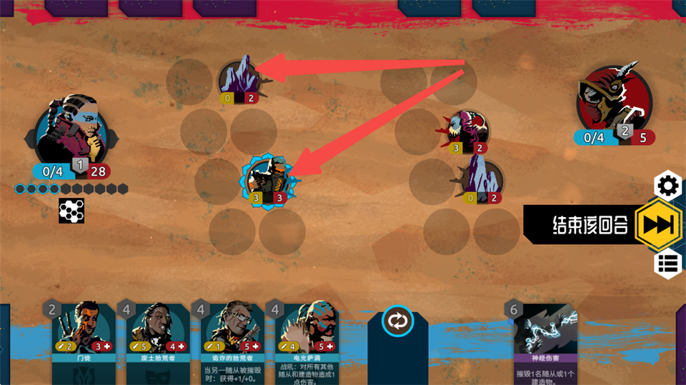 6.下一回合开始,该随从恢复精力,可进行攻击或移动,且每回合行动一次后便会进入疲惫状态,可行动随从带有黄色三角标识。