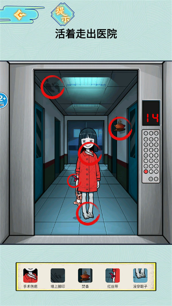 1.对天花板上的脚印、女孩的双脚、手中红丝带、脖子疤痕以及病房旁焚香进行点击查看。