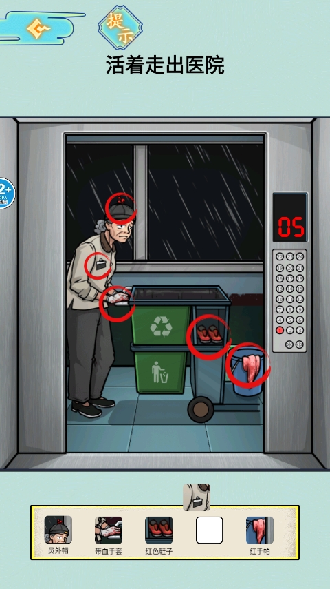 3.点击头上帽子、带血手套、鞋子、红色手帕以及胸口牌子,之后让其进入并跟随其行动。
