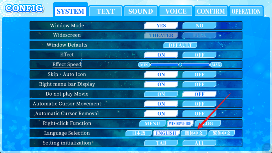 2.进入游戏后,点击CONFIG选项进入设置界面。