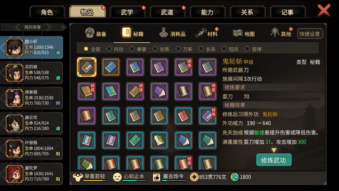 武器:匕首(新手建议剑刀枪,匕首卡位相当难受;可长按武器图标查看功法来源)