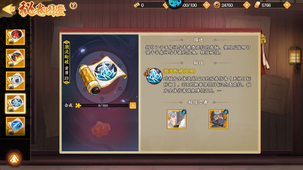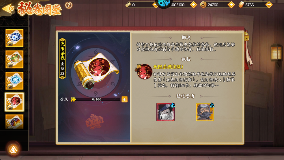 卷轴封印了桃地再不斩与半藏的查克拉,使用后能召唤出桃地再不斩和半藏的分身,释放出秘技。