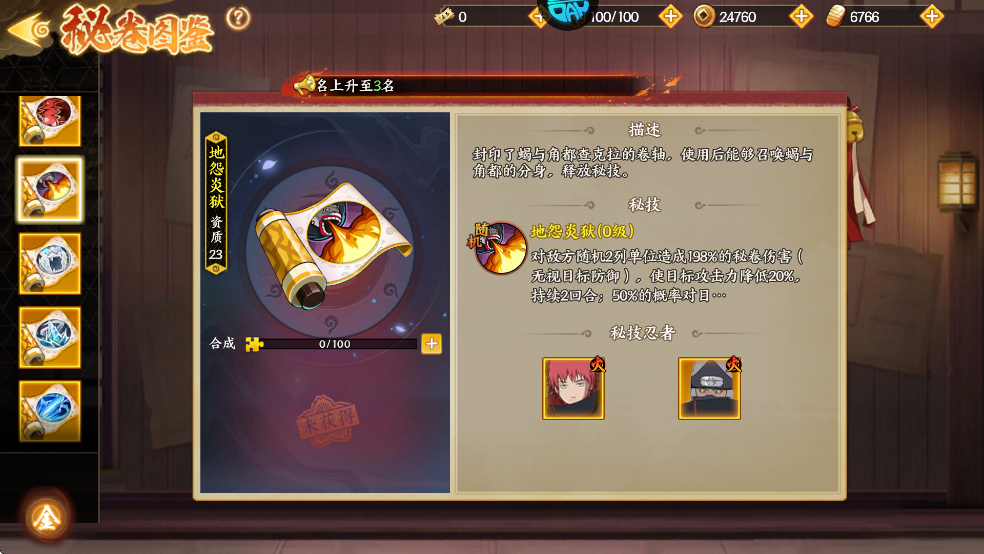此卷轴封印了蝎与角都的查克拉,使用时可以召唤出蝎和角都的分身,由分身施展秘技。