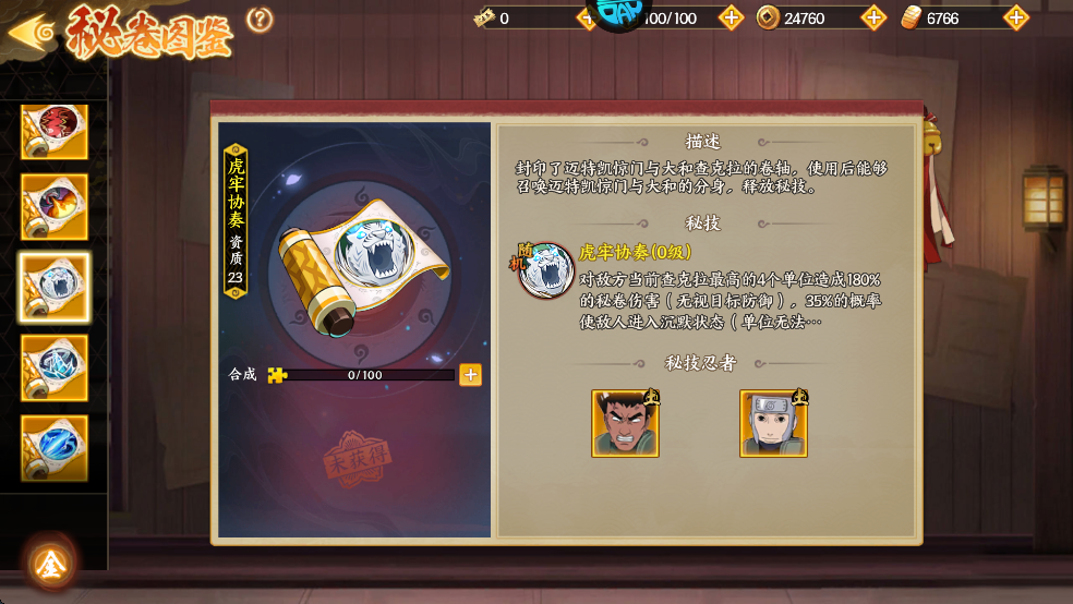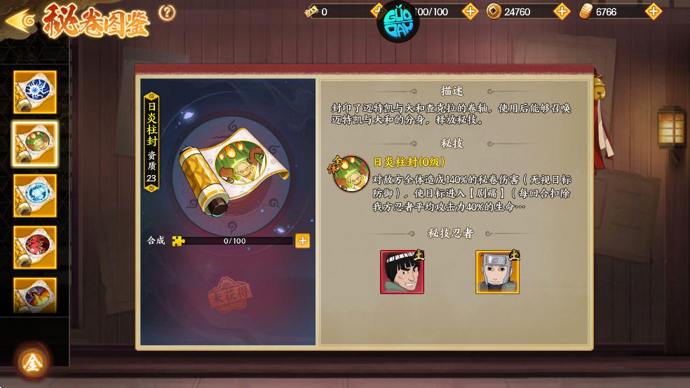 封印着迈特凯惊门状态与大和查克拉的卷轴,使用后能召唤出迈特凯惊门和大和的分身,让他们释放秘技。