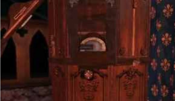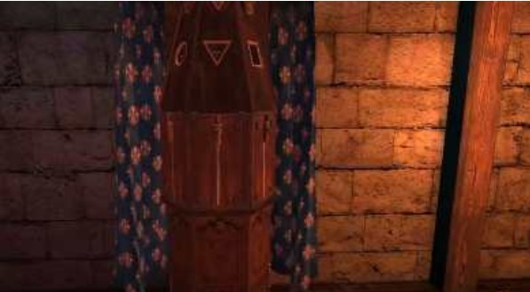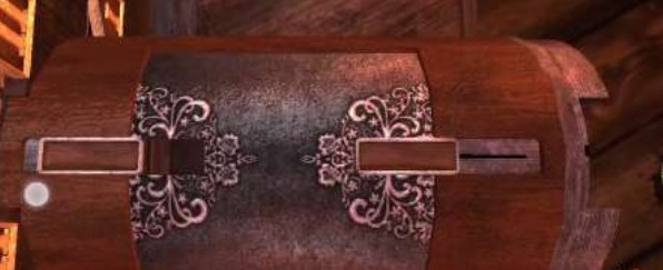 12.来到中心木桌处,放入金属公羊头,拿到雕刻的金属手柄,回到帘布的大木块处放入金属手柄并转动。
