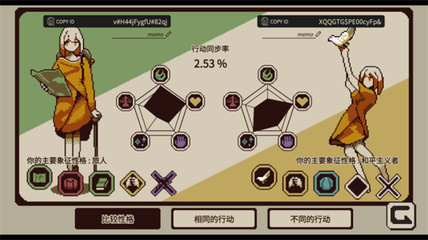 1.与特定对象开展性格比对,输入双方测试结果ID,即可了解彼此性格、相同与不同行动,还能查看行动同步率,且比较界面支持输入文字分享至社交渠道。