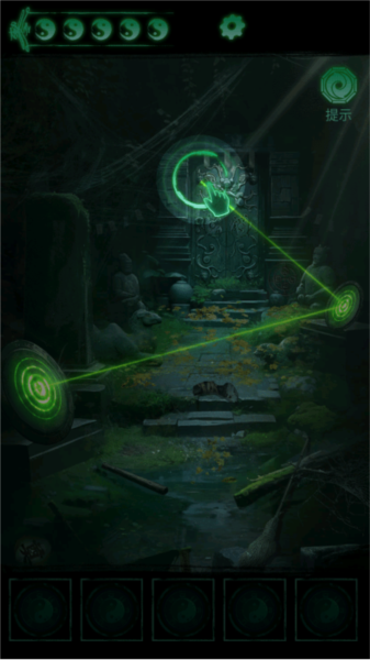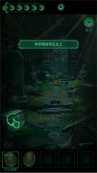 ①先拾取地上的左右铜镜,将其放置在石台上并调整角度,点击三下龙头让光线呈北斗七星状,激活石门中间的四象八卦机关。