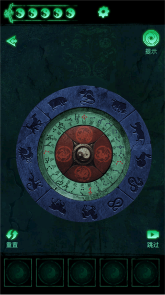 ③点击墓门上的四象八卦机关,依据石柱刻痕调整二十八星宿和十二生肖与四象对应,再按石碑线索转动圆环打开墓门。