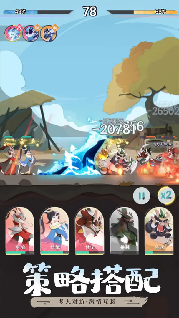 1、可自由调整队伍阵型,利用武将技能范围、攻击类型和属性克制设计战术,例如将高爆发刺客型武将置于侧翼突袭敌方后排;