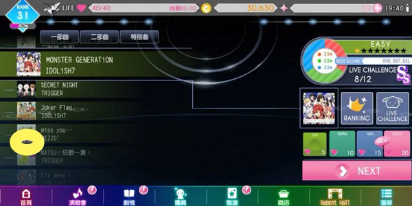 3.在主界面不仅能自由选歌,还可选择歌曲难易程度。爱娜娜的歌曲大致有EASY、NORMAL、HARD、EXPERT四个难度,细分下来从1星到8星不等。