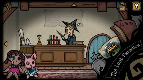 这里我们就可以点击莉莉的床,就会睡觉度过一晚了。来到第二天,安娜就说莉莉不见了的对话,对话结束后,我们就点击她的魔法书,多点击几下就可以翻页获得火柴,左边的木桶上还可以获得太阳魔法卷轴。