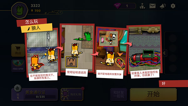 趁客人不备发起偷袭,可钻地道逃脱,通过破坏配电箱、放置炸弹搞破坏,客人没拆完炸弹则狼人获胜。