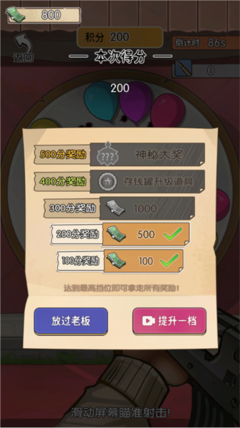 8.按射中气球数打分,200分得500元奖励。