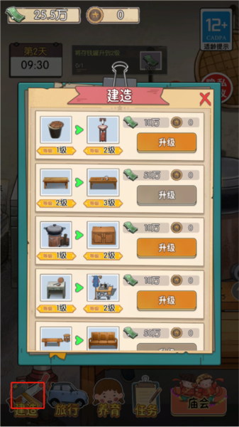 11.点击“回家”再“建造”,升级家具。