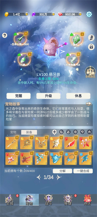 4.宠物选择先以生命橙宠为主,搭配一个暴击和一个暗属性宠物,