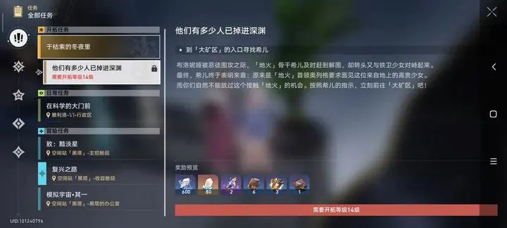 当我们前往雅利洛后,就能开启经验和金币本,解锁副本后为了避免体力溢出我们就可以打几把获取角色经验和信用点(金币),然后当主线推进到和布洛妮娅对战后,会要求我们14级后再来。此时我们就可以回头清理地图各处的支线任务并且刷副本消耗体力提升角色练度了。后续遇到剧情也是同样的道理。
