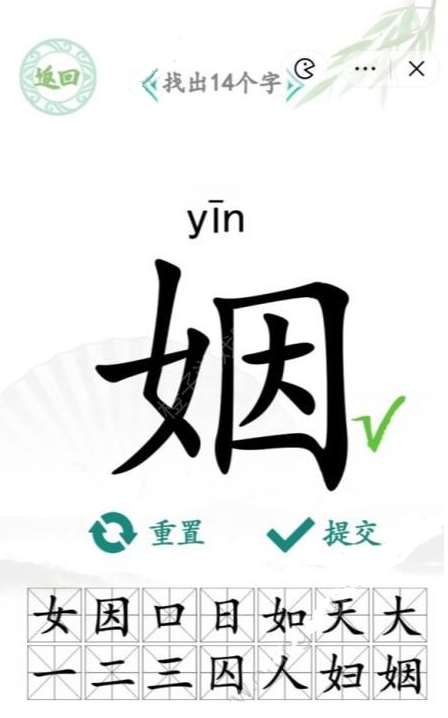 【姻】、【因】、【日】、【口】、【如】、【妇】、【女】、【天】、【大】、【囚】、【人】、【三】、【二】、【一】。