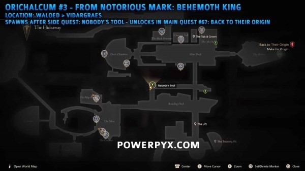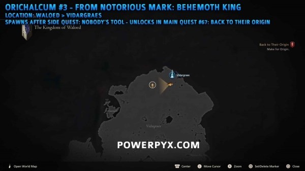 由恶名精英【帝王贝希摩斯】掉落,位于沃鲁德-维达草原(在主线任务67始源期间完成系列支线后刷新)。下方第一张图片为任务初始位置,第二张图片为任务结束后怪物的位置。