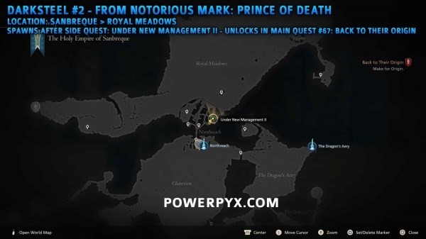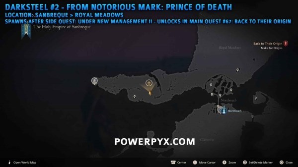 由恶名精英【死亡王子】掉落,位于桑布雷克皇家孪晶丘陵西侧草地(需要先完成主线任务67始源期间的支线任务后才会出现)。下方第一张图片为任务初始位置,第二张图片为任务结束后怪物的位置。