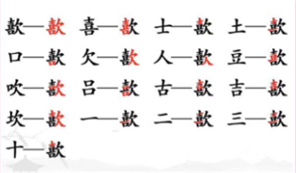 汉字找茬王是抖音中爆火的小游戏之一,需要根据图中给出的生僻字中拆字找出常见的字,本关为歖(xi),完整的通关答案为歖、喜、士、土、口、欠、人、豆、吹、吕、吉、古、坎、一、二、三、十。