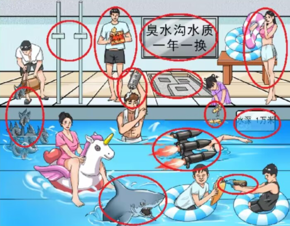 疯狂梗传黑心游泳馆这一关中需要大家帮忙把黑心游泳馆的价格打下来。大家在图中使用放大镜移动至图中各处。完整结果内容见下文!