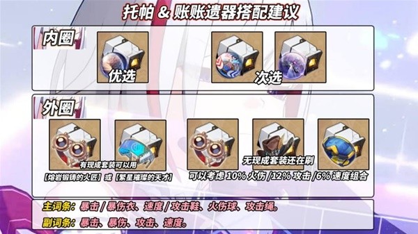 1、内圈:优选【停转的萨尔索图】。提升追击伤害和暴击率,可以全覆盖托帕伤害。次选【繁星竞技场】、【太空封印站】。