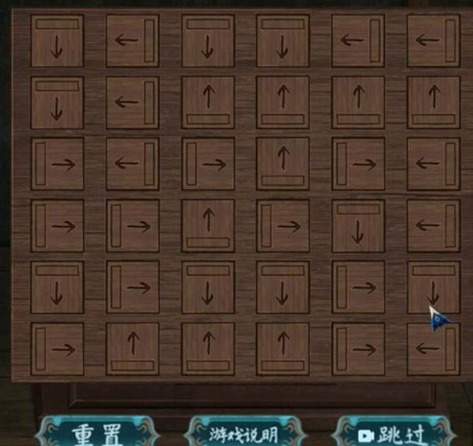 1、进入游戏之后调查墙缝可以获得钥匙,然后输入下图所示的密码,把所有盘子放到右边。