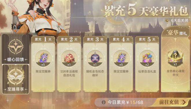 基础15元累充无需多讲,每日68元累充关键在第一天和第四天的5张限定券。连续5天充值至少340元的金色核心魂骨符文为随机奖励,随到新奖励不亏,随到已有奖励则不尽如人意。此次68元累充与全新通行证一同上线,未出现上次通行证上线2天后才出累充活动的背刺情况。