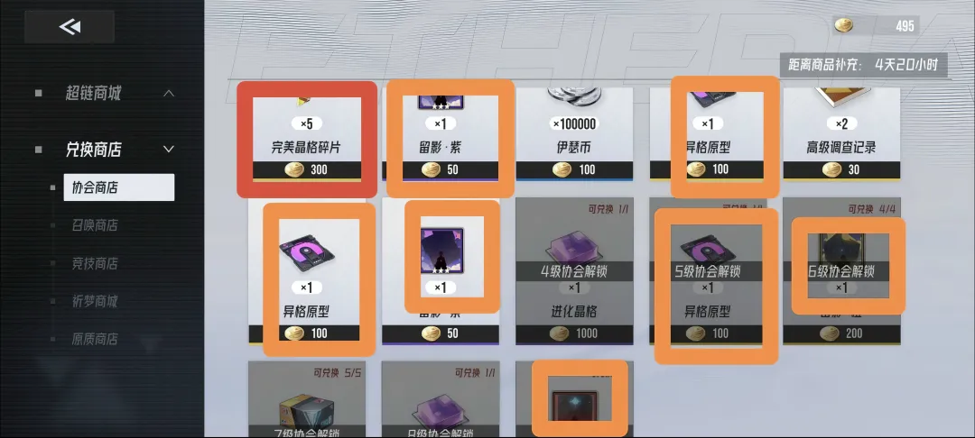 协会币兑换:优先兑换图中圈出的高性价比道具。至于晶格碎片保证刷新前可以兑换即可