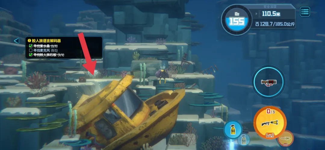 麦克风在浅海地图左下角的遇难船里面(约110米深度)