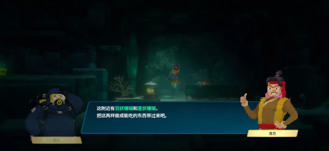 上岸做好翻译器之后,再次来到深海的石室,鲛人说要用羽状珊瑚和莲状珊瑚做成料理给他
