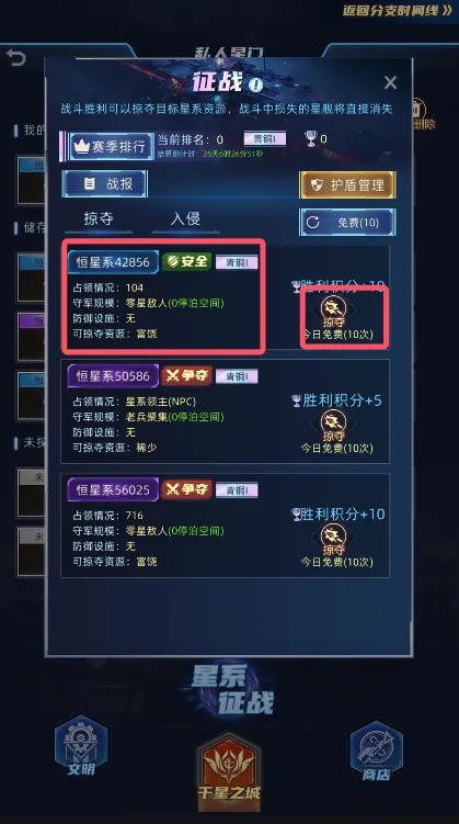 每个星系的恒星和小行星带可建立炮台防御,玩家还可在【驻守舰队】界面派遣星舰驻防,增强防御能力。征战时,玩家每日有十次免费刷新次数,每次刷新展示三个星系供选择掠夺。掠夺将夺取目标恒星系50%未领取资源,至少掠夺1小时累计资源。战斗胜利积分根据双方段位差调整,基础分为10分,高出目标段位每级减1分,最低1分;低于目标段位每级加1分,最高20分。攻击NPC获得固定积分。